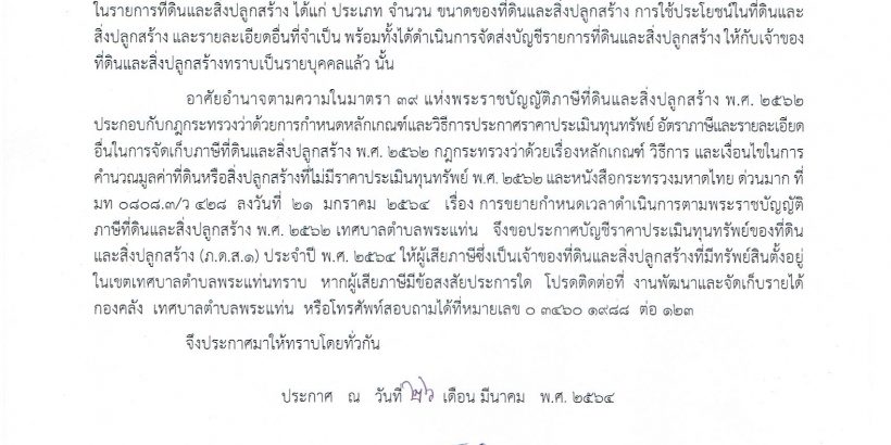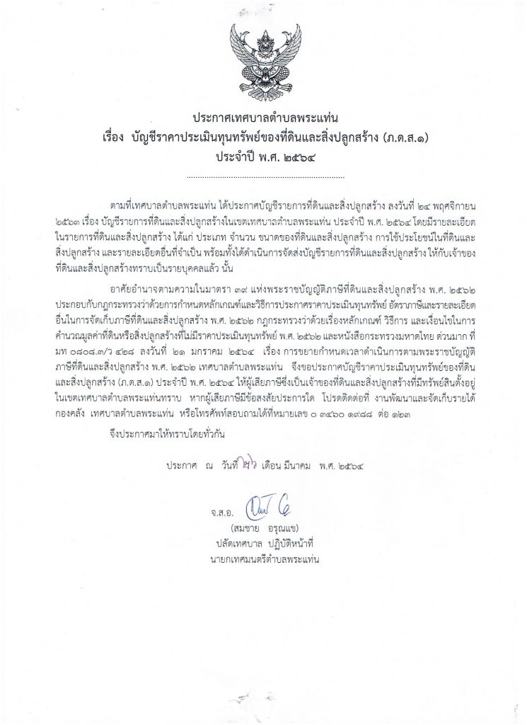 ประกาศราคาประเมินทุนทรัพย์ของที่ดินและสิ่งปลูกสร้าง (ภ.ด.ส.1)ประจำปี 2564